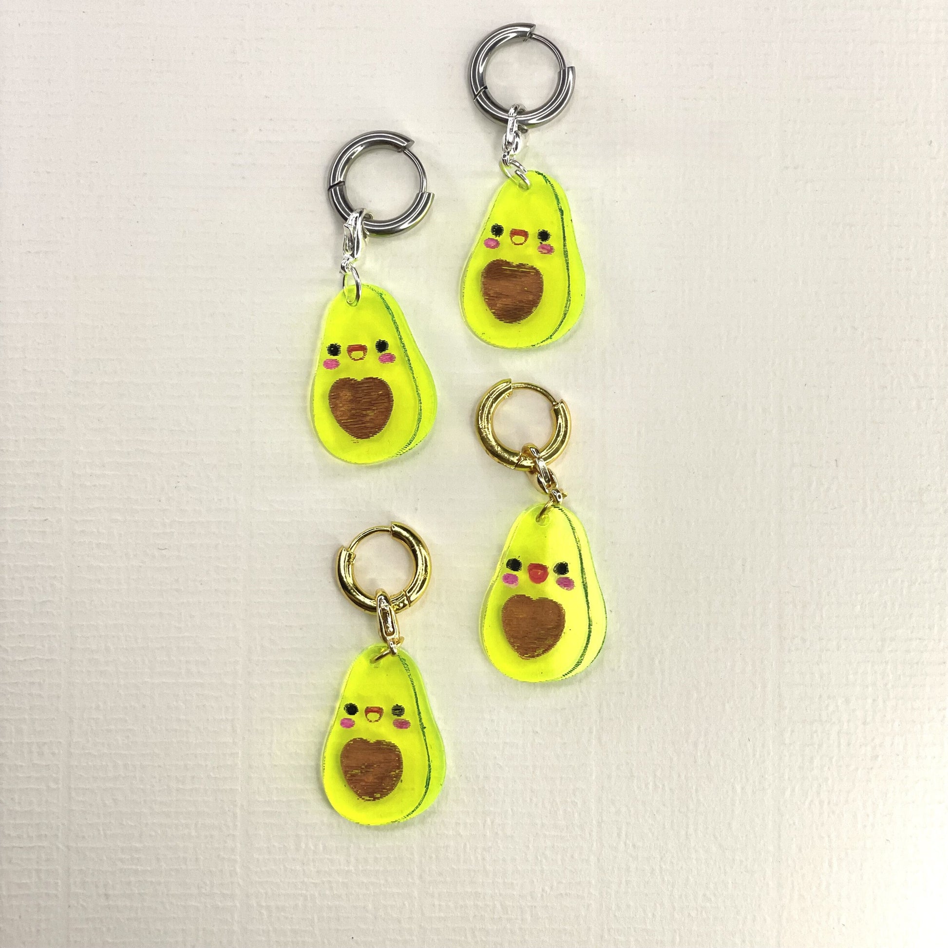 A vibrant neon green sliced avocado charm featuring hand-painted details like eyes, a smile, and a cute seed.